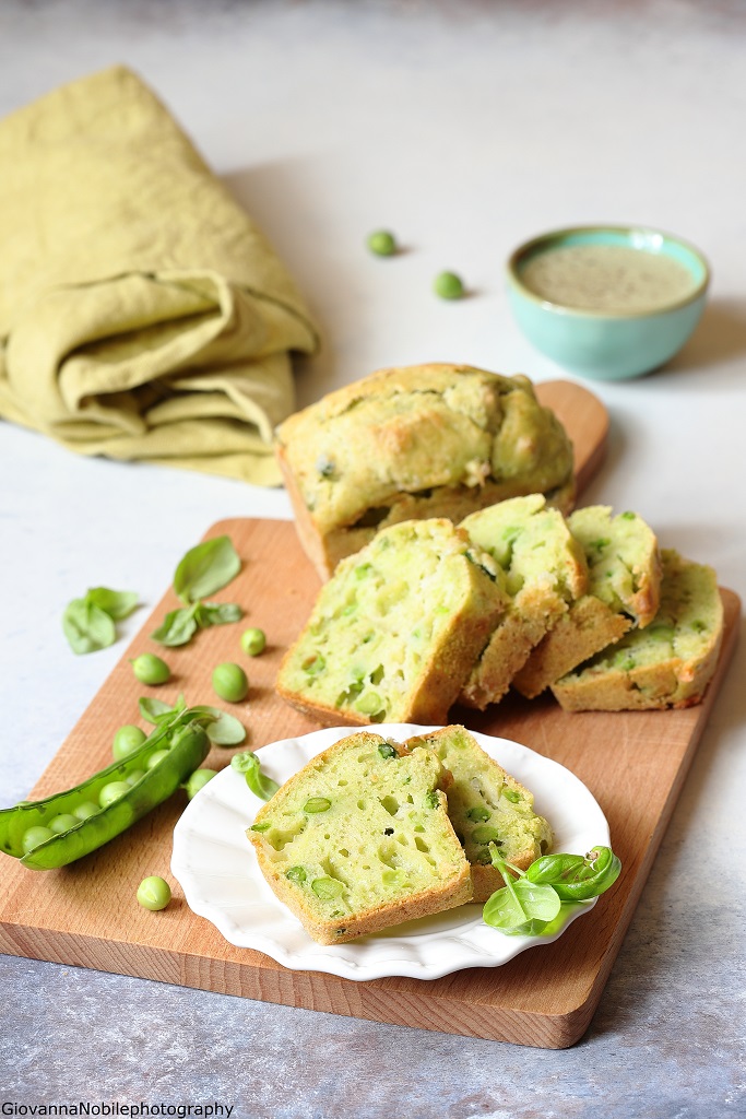 Mini cake con piselli e scamorza, arricchiti da una fresca crema di yogurt al basilico